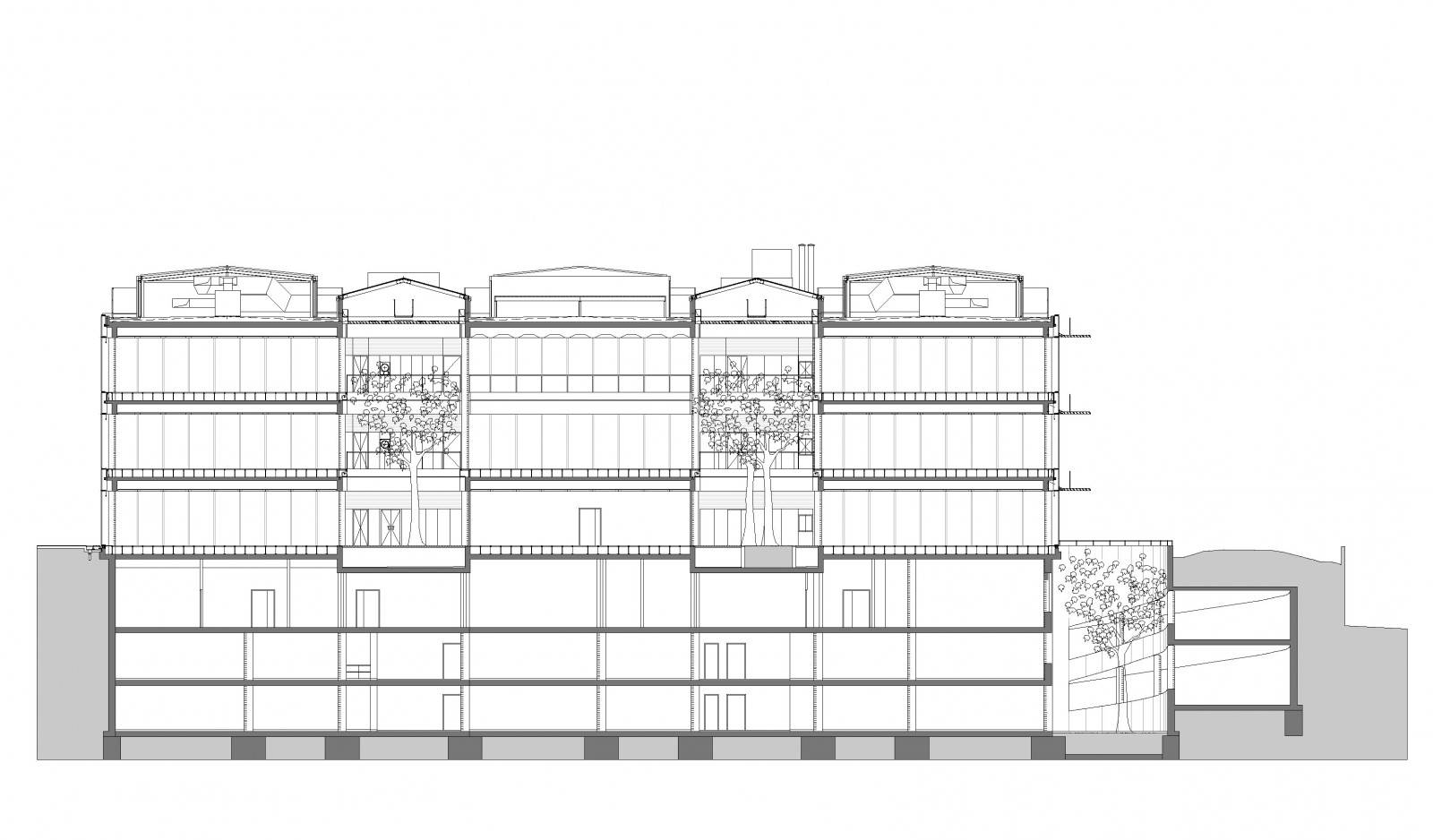 The upper floors house the offices and calculation centre; the basement floors are used for archives, workshops and parking. Three rectangular platforms of more than 540m2 on each floor house open plan office space. The structure is flanked by four service towers containing the vertical circulation, technical installations and washroom facilities. The three office modules are connected by two rectangular roof-top atriums. The variation in texture and colour of the façade intimates the interior layout of the building.
