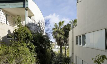 The rationalist language of the properties is softened by the vaulted roofs made of green patina copper, the teak wood panelling and a Venetian plastering. As time goes by, its dialogue with the trees and the Mediterranean Sea is more and more natural as well as fruitful; so much so that when the gate is crossed and we enter into the garden we perceive a cheerful and sonorous silence.